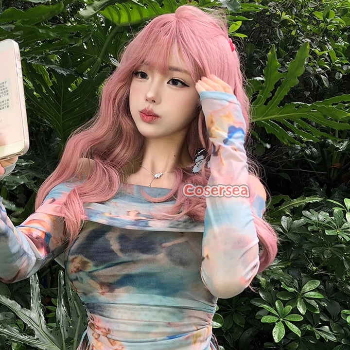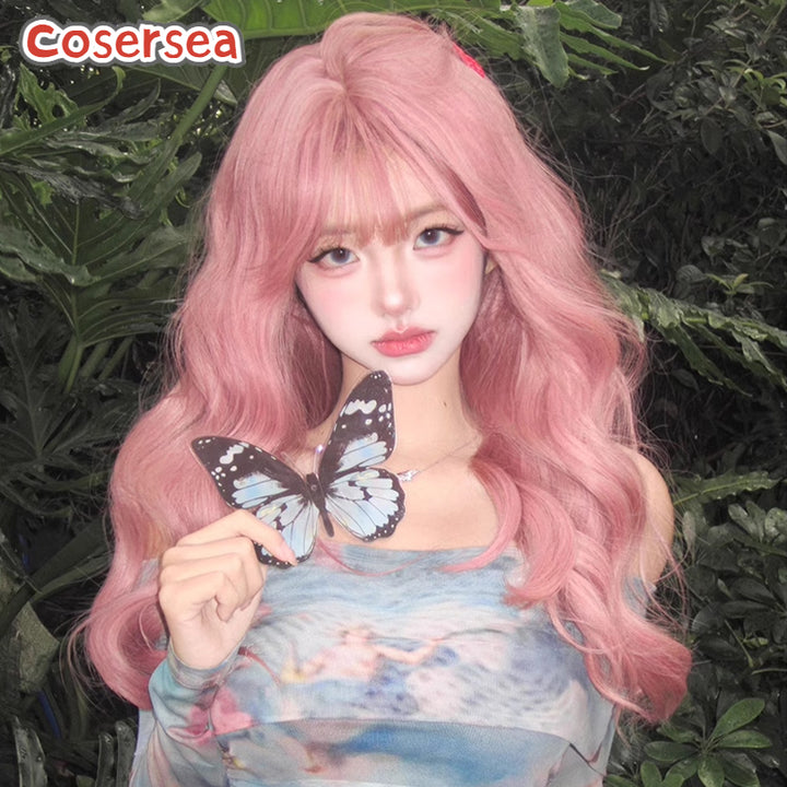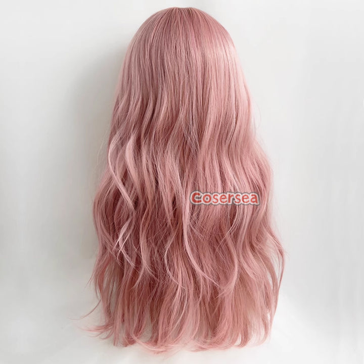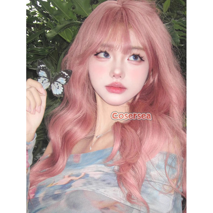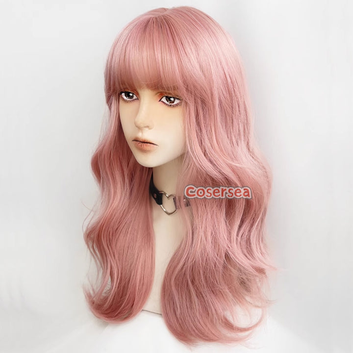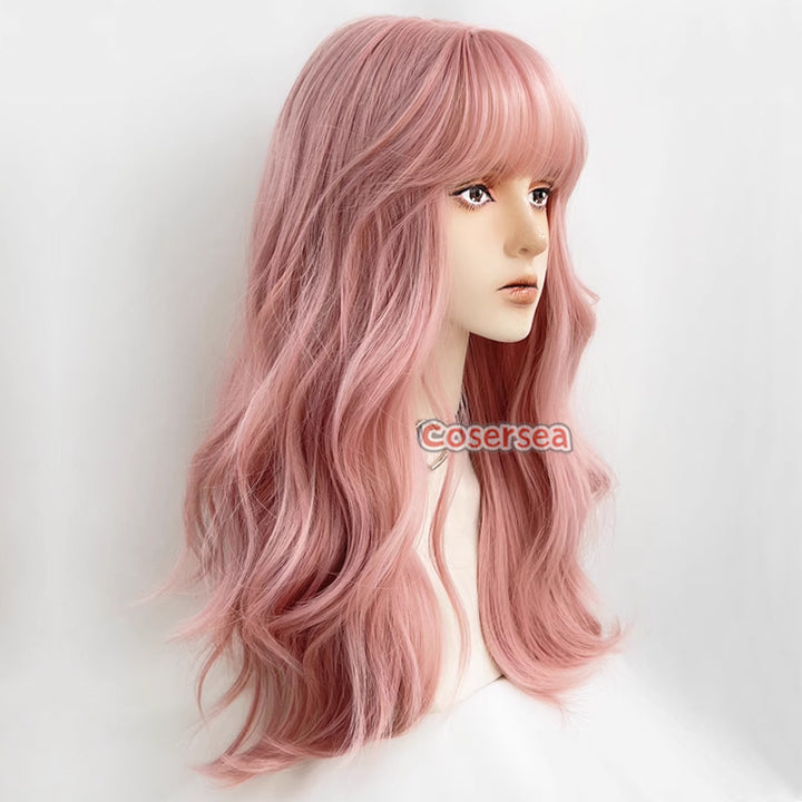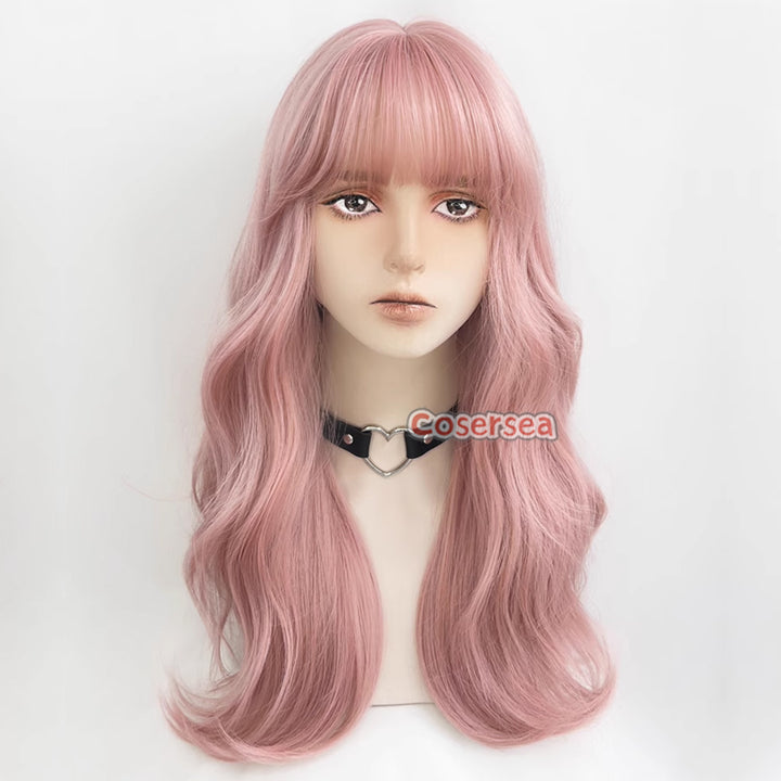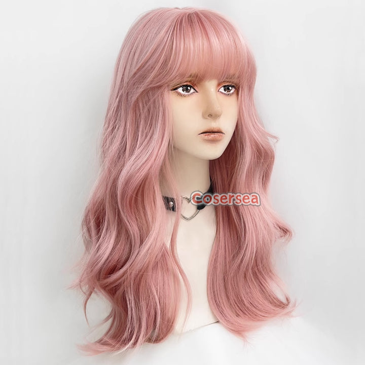 55cm Women Long Loose Wavy Pink Lolita Wigs With Bangs