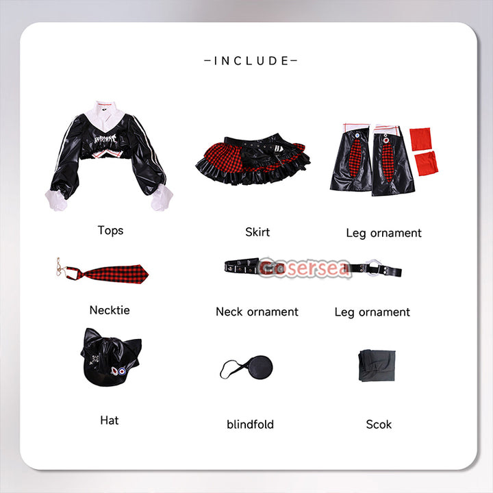 Included: Tops, Skirt, Leg ornament, Necktie, Neck ornament, Leg ornament, Hat, Blindfold, Sock