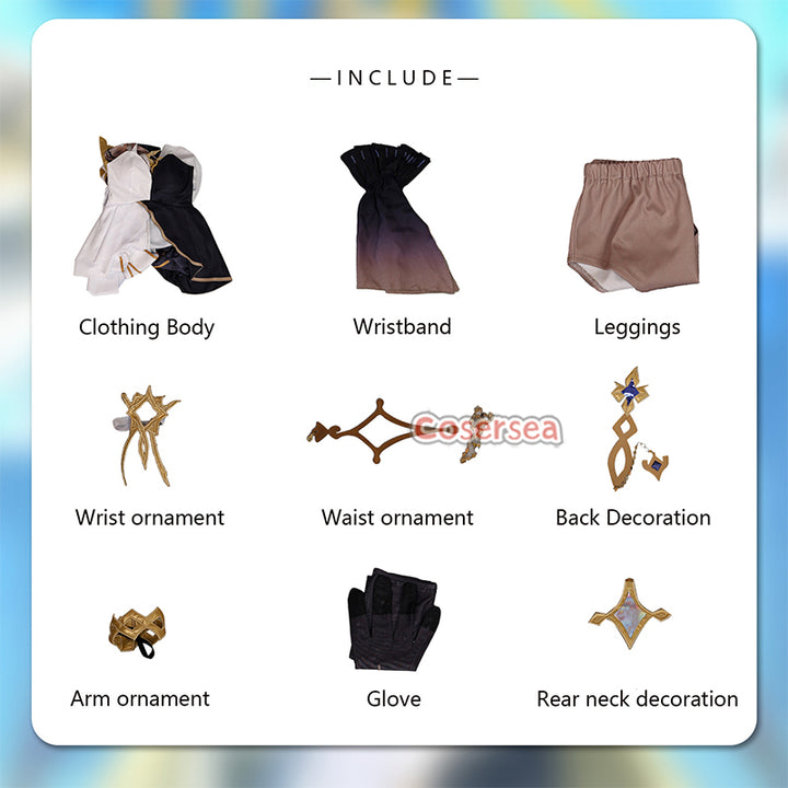 Included: Clothing body, Wristband, Leggings, Wrist ornament, Waist ornament, Back decoration, Arm ornament, Glove, Rear neck decoration