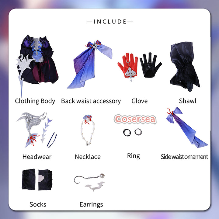 Included: Clothing body, Back waist accessory, Glove, Shawl, Headwear, Necklace, Ring, Side waist ornament, Socks, Earrings