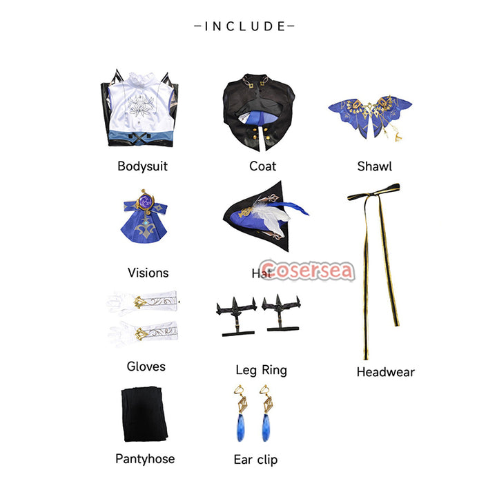 Included: Bodysuit, Coat, Shawl, Visions, Hat, Gloves, Leg ring, Pantyhose, Ear clip, Headwear