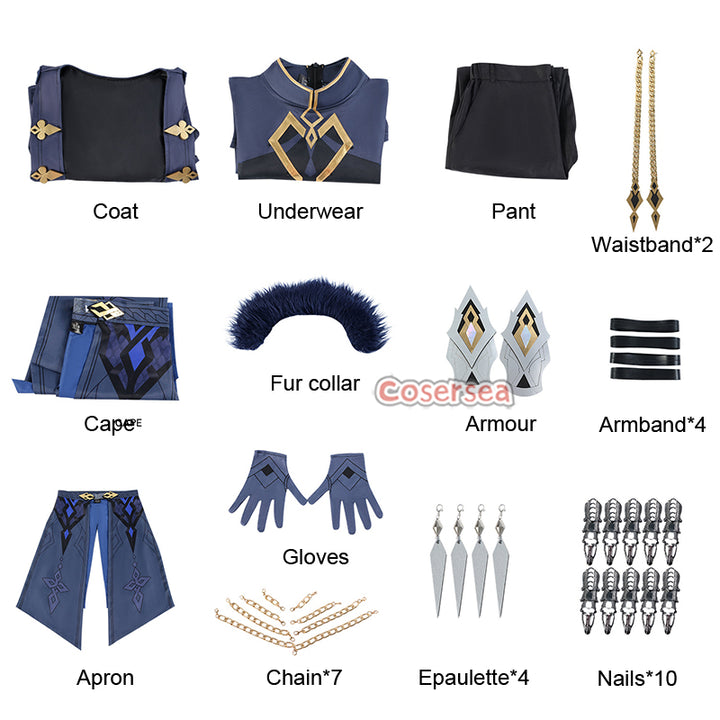 Included: Coat, Underwear, Pant, Waistband*2, Cape, Fur collar, Armour, Armband, Apron, Gloves, Chain*7, Epaulette*4, Nails*10