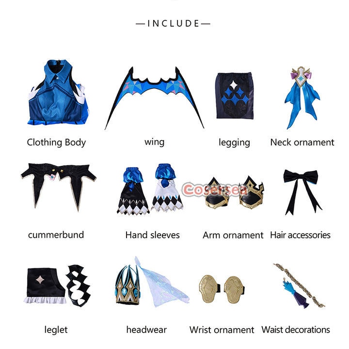 Included: Clothing body, Wing, Legging, Neck ornament, Cummerbund, Hand sleeves, Arm ornament, Hair accessories, Leglet, Headwear, Wrist ornament, Waist decorations