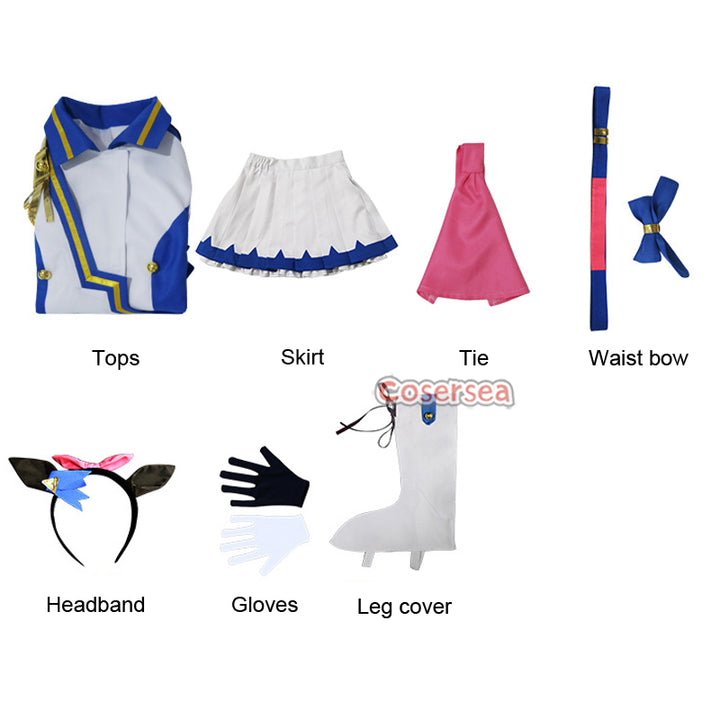 Included: Tops, Skirt, Tie, Waist bow, Headband, Gloves, Leg cover