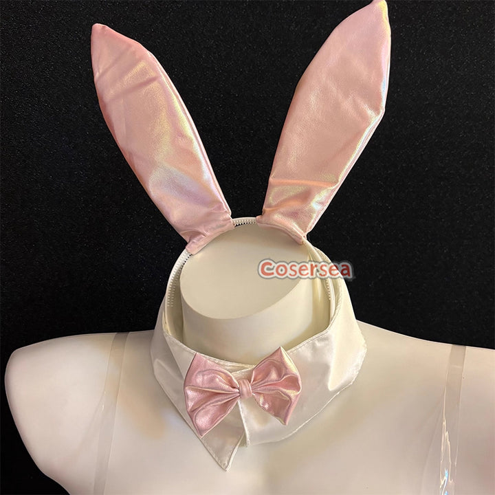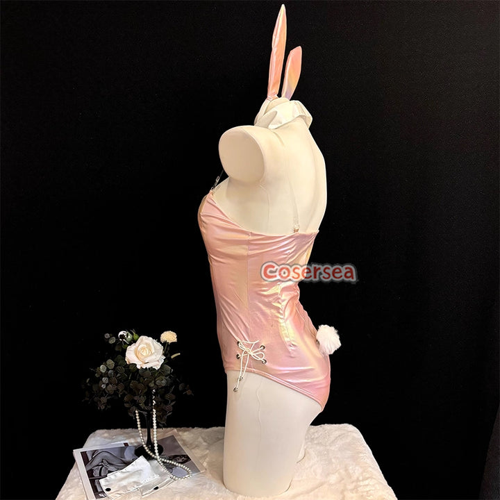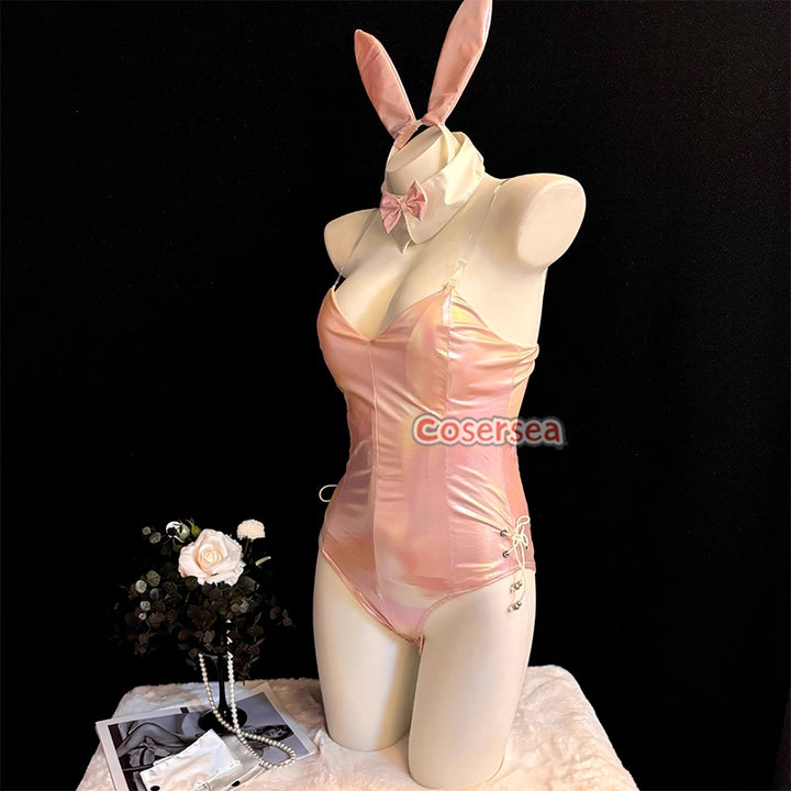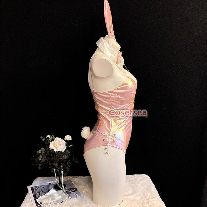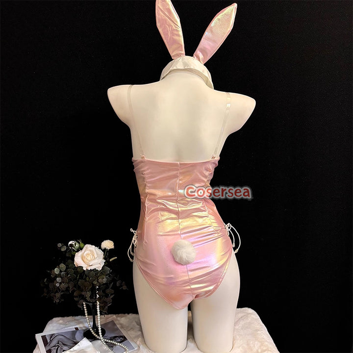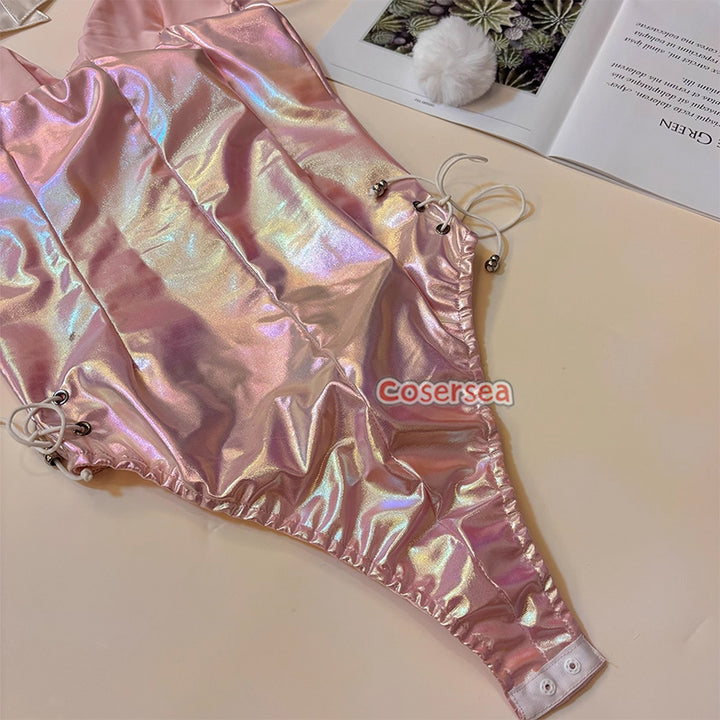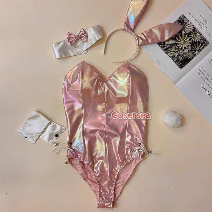 Sexy Kawaii Women Shiny Pink Holographic Bunny Cosplay Costume Bodysuit Jumpsuit