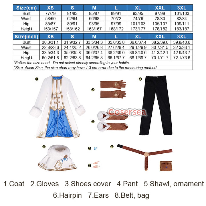 Included: Coat, Gloves, Shoes cover, Pant, Shawl, Ornament, Hairpin, Ears, Belt, Bag